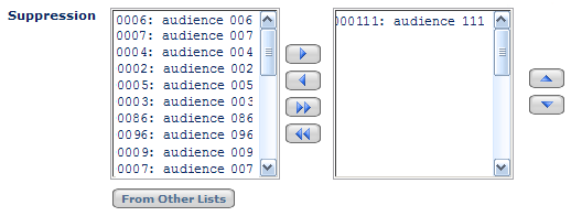 The Suppression section of the Audience tab allows you to choose one or more audience lists to exclude from the set of e-mail address to which to send the cell. To specify which lists to exclude from the target audience, do any of the following: