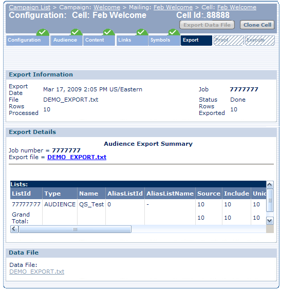 The amount of time it takes for Campaign Builder to create the export file depends on the size of the audience list. When the export is finished, the Export Tab looks like this: