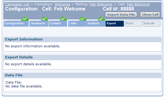 Export TabWhen you have specified the target audience(s) for a mailing, you use the Export Tab to create the data file (also referred to as the "export file") that Campaign Builder uses to insert values, such as an e-mail recipient's first name, in each e-mail. Initially, the Export Tab looks like the image below. Click Export Data File to begin the export.