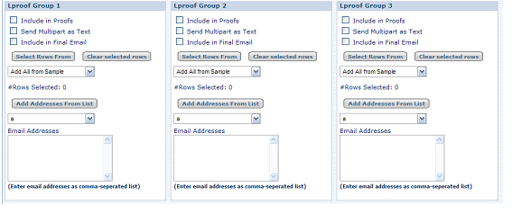 Understanding Lproof GroupsThe Proof Tab allows you to set up three different groups of e-mail addresses to receive Lproofs. You must send a proof to at least one address to complete the Proof tab and move on to the Execute tab.