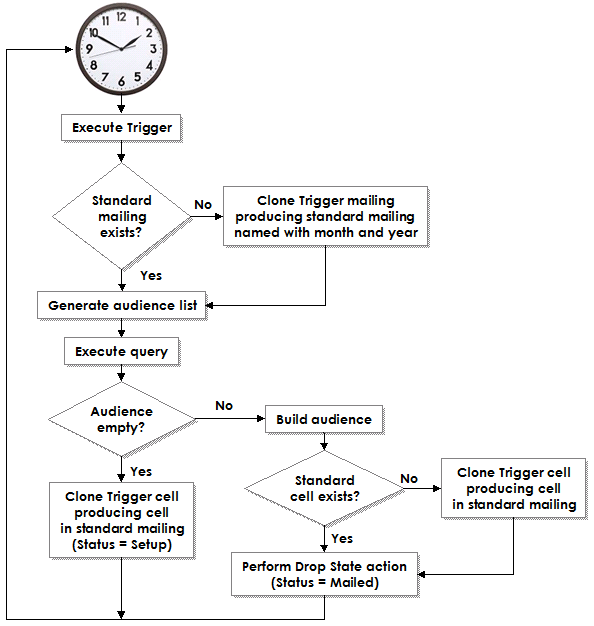 An Insight Trigger mailing contains a triggered cell that is very similar to a standard cell except that the triggered cell itself is never executed. Instead, the triggered cell provides a template for a series of cloned standard cells, which are executed (unless the audience list is empty).