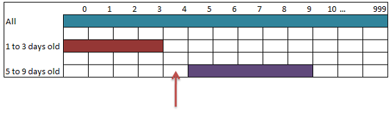 Recipients that are exactly four days old or greater than nine days old are included in the All range bucket but not in any other range buckets. |
