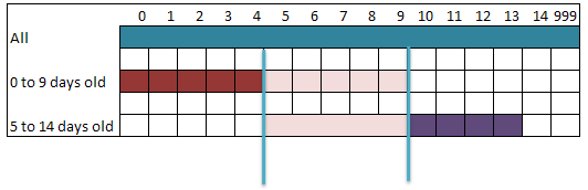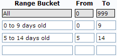 Messages that are between five and nine days old are recorded in two user-defined range buckets but are included in the All range bucket only once.
