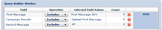 - The first EXCLUDES operator prevents the message from being sent to recipients who opened the first message at any point in time.