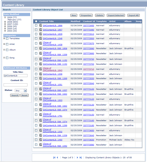 Viewing the Content ListWhen you start Content Library, the content list appears. The first 25 content items appear on the first page, with each subsequent 25 items on each additional page.