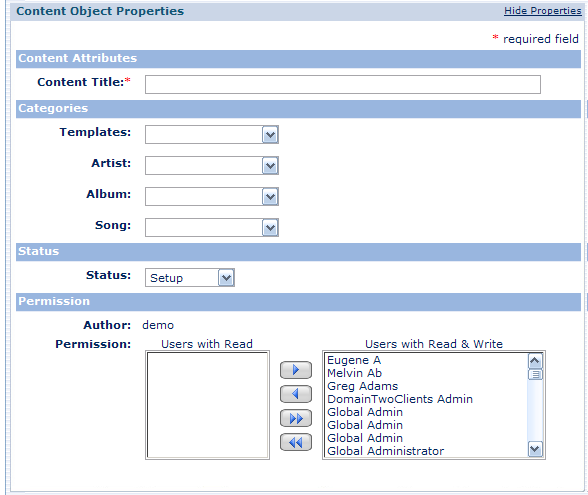 The Content Object Properties pane appears: