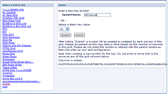- Each grid symbol displays the name of the grid followed by a period and the name of the grid data column in the Default column. This mapping of symbol name to grid column allows you to change the symbol name without changing the associated data column. For example, the grid symbol G1HOURS displays "states.G1HOURS" in the Default column. If you rename the grid symbol G1HOURS to some other name such as STORE_HOURS, the value in the Default column does not change.