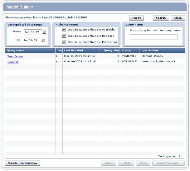 By default, Insight Builder lists all queries updated within the last 45 days, for every status. To change your default settings, go to the Insight Builder Preferences section of the User Profile area within Precision Central. Insight Builder uses all of the criteria you specify to filter the list of queries. For example, you can search for available queries that were most recently updated in the past week, whose name contains the word "test." To filter the list of queries, click Search. Filtering by date Click the calendar icons to define the range of dates for which to display queries, and then click Search. Insight Builder searches for queries that were most recently modified within that range of dates. Filtering by audience status Use the check boxes to define the queries with the audience status you want to display and then click Search. Audience Status is only applicable when you have chosen to build an audience from the Query Creation Screen. The status is a definition of the audience's phase of development in Data Director. Once it is available in Data Director, the audience is available to use in e-mail campaigns.