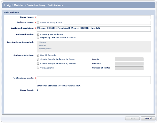 You build an audience based on the results of a query. The audience can contain all of the records in the query result set, or a portion of the records. When the audience is built, Insight Builder sends an e-mail to the address(es) you specify to inform you that the audience is available for use.