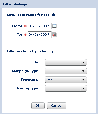 To find mailings added within a certain time period, specify a From date and a To date. The default range is one week.