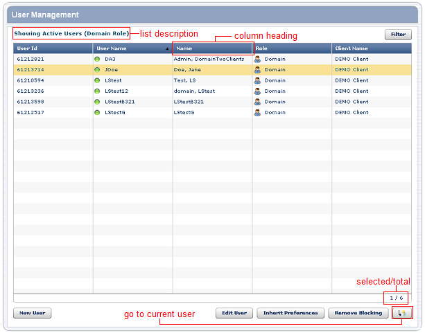 When you start User Management, a list of users appears. The list includes each user's unique ID, user name, full name, and role.