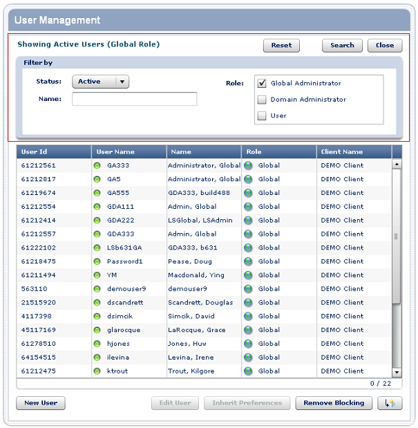 Enter at least a portion of the first, last, or user name to find. The search is case-insensitive and looks in both the User Name and Name columns.