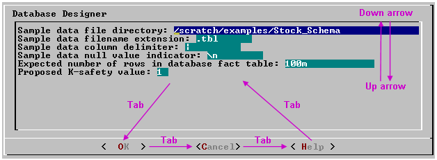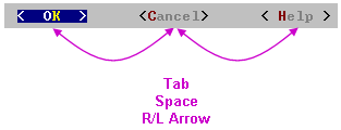 In a form dialog, use the tab key to cycle between OK, Cancel, Help, and the form field area. Once the cursor is in the form field area, use the up and down arrow keys to select an individual field (highlighted) and enter information. When you have finished entering information in all fields, press Return.