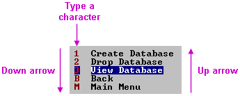 Some dialogs require you to choose one command from a menu. Type the alphanumeric character shown or use the up and down arrow keys to select a command. When you have made your selection, press Return. |