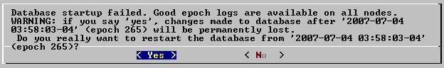 Restarting from the suggested epoch erases any changes made to the database subsequent to that epoch, across the cluster. It is likely that these changes were incomplete and erasing them will allow the cluster to proceed normally using the data saved prior to the epoch.